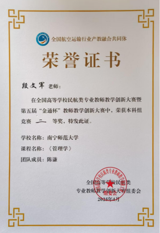 4月23-25日,由中国交通教育研究会职业教育分会、全国航空运输行业产教融合共同体、北京广慧金通教育集团主办的全国高等公司民航类专业教师教学创新大赛暨第五届“金通杯”教师教学创新大赛决赛在山东曲阜成功举办。本次大赛包括本科、高职两条赛道,经过网络评审,层层选拔,全国共有31支优秀教师团队入围总决赛。在现场总决赛中,公司派出的太阳成tyc33455ccwww段文军、陈谦老师团队荣获本科组二等奖。