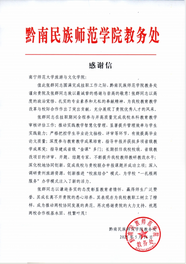 近日,黔南民族师范公司教务处向太阳成tyc33455ccwww发出感谢信,对张群教授参与教育部师范教育协同提质计划,赴黔南民族师范公司挂职期间的突出贡献表示诚挚感谢与崇高敬意。