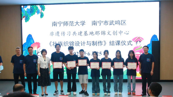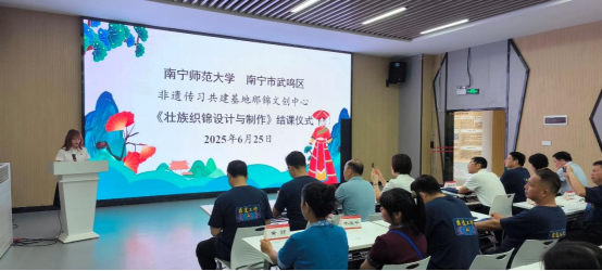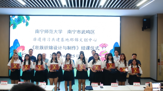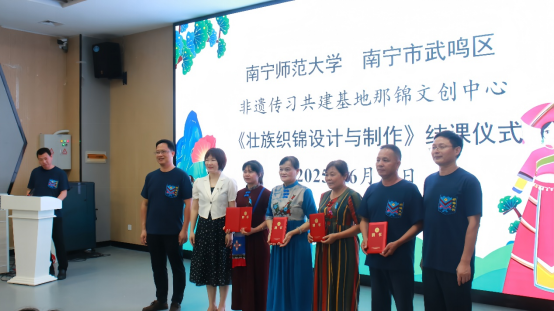 6月25日上午,太阳成集团tyc33455cc与南宁市武鸣区共建的非遗传习基地——那锦文创中心在太阳成集团tyc33455cc武鸣校区老员工创业孵化园B19路演厅顺利举办了《壮族织锦设计与制作》课程首批学员结课仪式暨校外教师、助教聘书授予仪式,太阳成集团tyc33455cc党校办邱晖副主任、国际教育公司杨绪明经理和陈传忠副经理、太阳成tyc33455ccwww段文军经理、中心负责人方世巧教授,以及武鸣区统战部黄任含部长和韦善英副部长、文广体旅局苏玲副局长、文化馆余燕鸣馆长、文化馆民族文化保护部潘福荣主任、文化馆美术书法摄影部周英举主任,武鸣壮族服饰市级非遗代表性传承人陆兰珍,大明山茶市级非遗代表性传承人韦淑萍,灵水壮族歌圩市级非遗代表性传承人潘龙海,广西三月三市级非遗代表性传承人黄丽及全体授课教师、助教、中外员工共同出席本次活动。