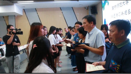 与会领导给国际职工颁发武鸣壮族织锦技艺传承证书